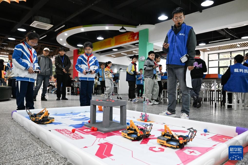 10月18日,学生在西安市新城区太华路小学参加机器人挑战赛。新华社记者 邹竞一 摄