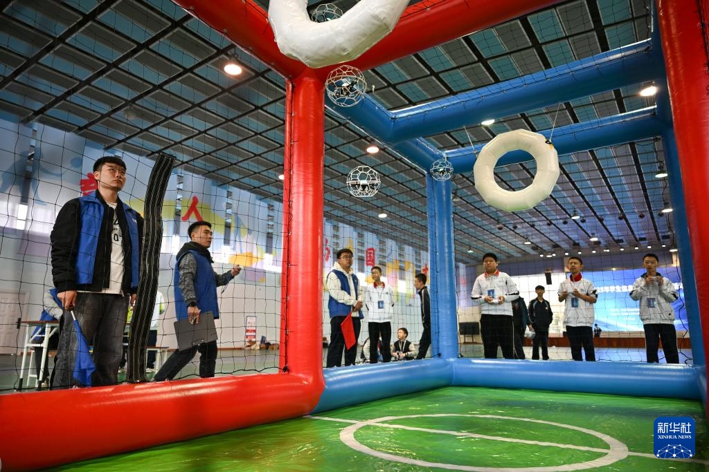 10月18日,学生在西安市新城区太华路小学参加多轴无人机足球对抗赛。新华社记者 邹竞一 摄